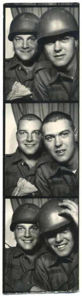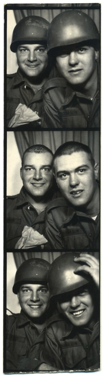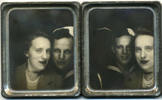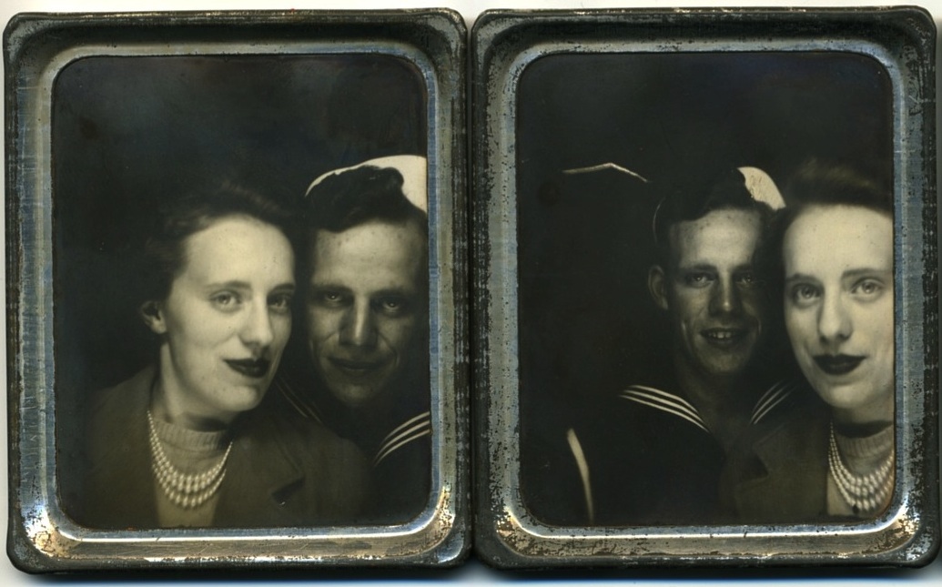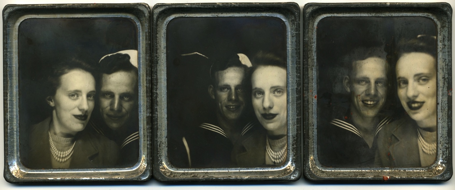 When searching for photobooth gems to add to my collection I always keep an eye out for any series of pictures that shows the same person in different poses or at different stages of their lives. Even if it is imagined, there is more of a story to be seen when a face is viewed in different modes. There is a tentativeness about their togetherness that I find endearing. Maybe they had just met. Maybe they were not demonstrative types. Given the era of these photos I am musing on the fate of these anonymous faces. Military service at any time is fraught with danger and uncertainty. Did this young man survive the war? If yes, did their relationship survive it?