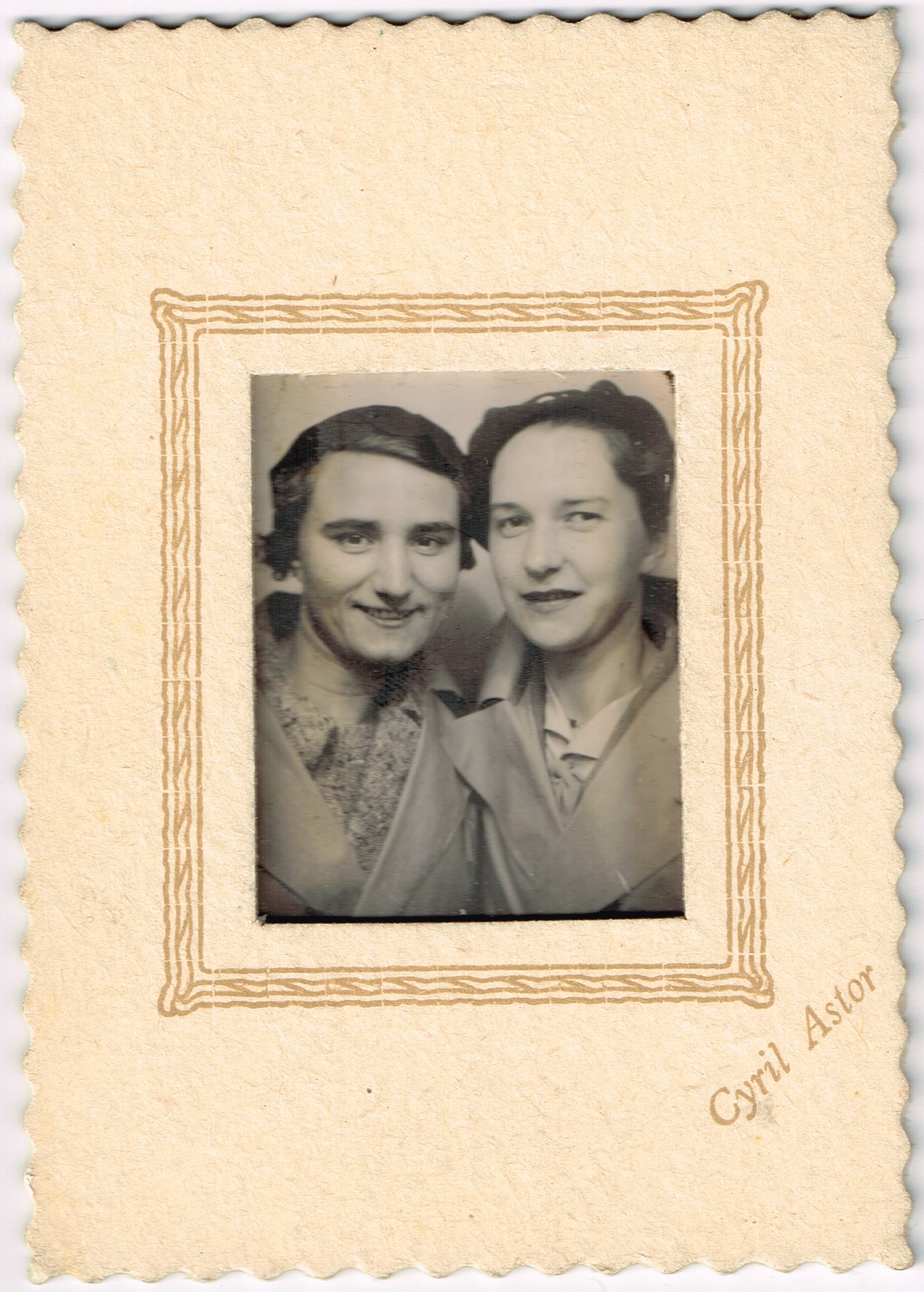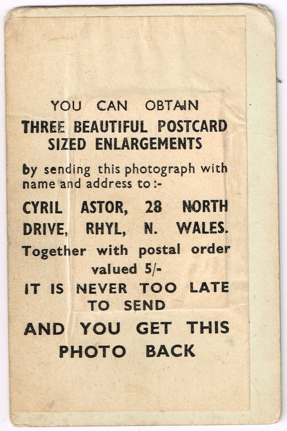 On the back of each of the cardboard photo frames it says, “Photographer: Cyril Astor. You can obtain three beautiful postcard sized enlargements by sending this photograph with name and address to Cyril Astor, 28, North Drive, Rhyl, North Wales. Together with postal order valued 5/-. It is never too late to send and you get this photo back.”  Of course it is too late now, despite the claim, but it does make me think there could be some fabulous photobooth postcard gems out there to be discovered!