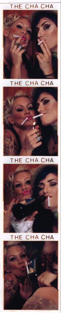 These women fulfill all the bad girl stereotypes – too much makeup, too many tattoos, too many rings, too little clothing, smoking, boozing, bleaching, artificially augmented lips – oh my god I adore them! The pièce de résistance is the cast on the brunette’s arm. Happily her wrist is not too sore to allow her to chug on a bottle of beer. If it had been, we wouldn’t have seen it, as in the strip below. A flash of tattooed thigh isn’t something you generally see in a photobooth either. Another big tick, thanks ladies!