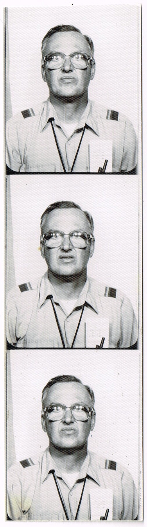 As a security guard he might’ve worked in a mall and therefore, could also have been regularly in the vicinity of many photobooth machines. Seeing people having fun retrieving their photos, might’ve tempted him to grab a few snaps for himself, to relieve the tedium of the job. If Babbette Hines found some of this gent, and I found some more, I wonder how many other strips of his might be out there?